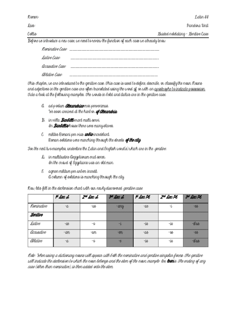 Nomen:Latin IIDies:Pandora UnitCollis: Guided notetaking Genitive Case Before we introduce a new case, we need to review the function of each case we already know.Nominative Case: ___ Dative Case:___Accusative