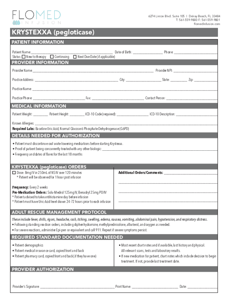 6274 Linton Blvd. Suite 105 | Delray Beach, FL 33484 T: 5615599800 F: 5615599801 flomedinfusion.comKRYSTEXXA (pegloticase) PATIENT INFORMATION Patient Name:___ Date of Birth: ___ Phone: ___ Status: