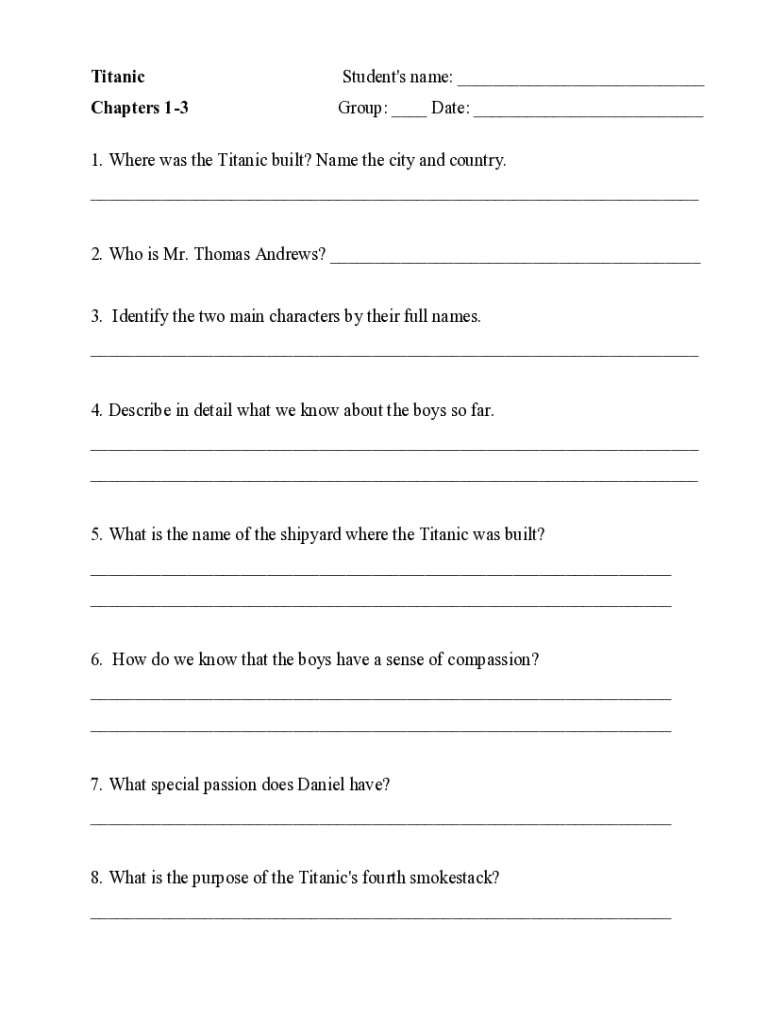 TitanicStudent\'s name: ___Chapters 13Group: ___ Date: ___1. Where was the Titanic built? Name the city and country. ___ 2. Who is Mr. Thomas Andrews? ___ 3. Identify the two main characters by their