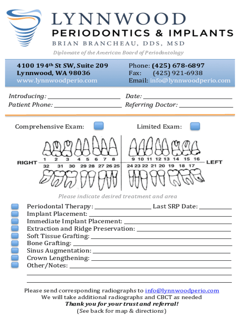 Diplomate of the American Board of Periodontology4100 194th St SW, Suite 209Phone: (425) 6786897Lynnwood, WA 98036Fax:(425) 9216938www.lynnwoodperio.comEmail: info@lynnwoodperio.comIntroducing: ___Date: