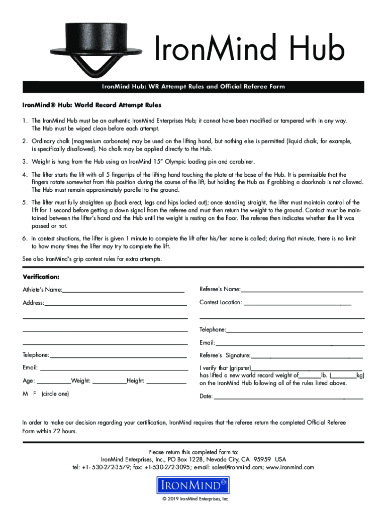 IronMind Hub IronMind Hub: WR Attempt Rules and Official Referee Form IronMind Hub: World Record Attempt Rules 1. The IronMind Hub must be an authentic IronMind Enterprises Hub; it cannot have been