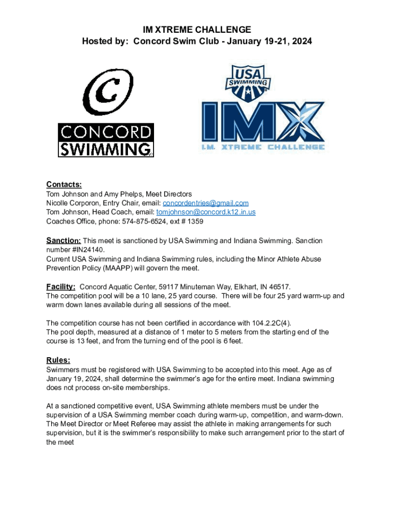 IM XTREME CHALLENGE Hosted by: Concord Swim Club January 1921, 2024Contacts: Tom Johnson and Amy Phelps, Meet Directors Nicolle Corporon, Entry Chair, email: concordentries@gmail.com Tom Johnson,