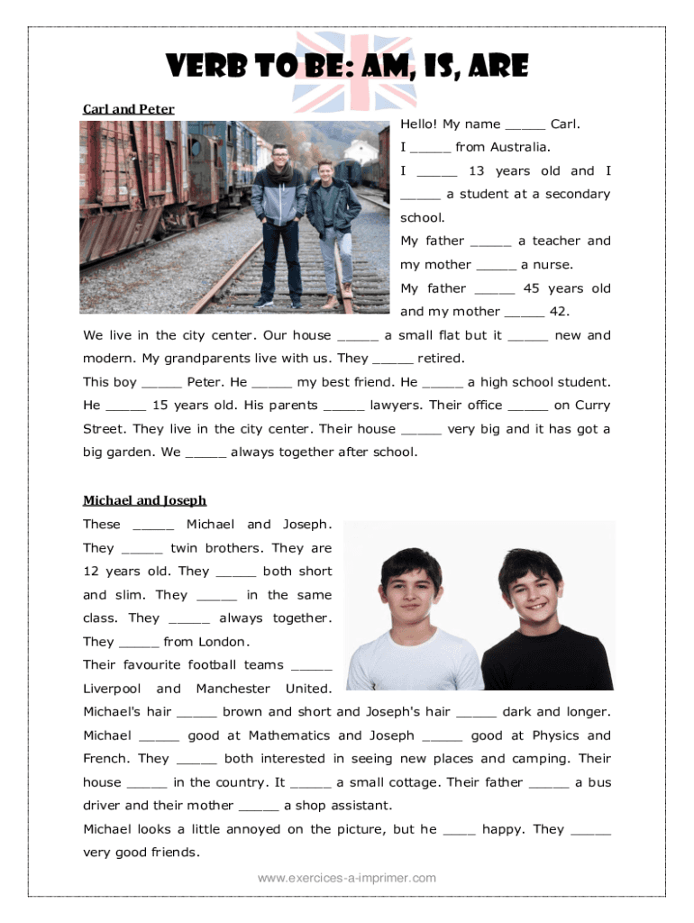 VERB TO BE: am, is, are Carl and PeterHello! My name ___ Carl. I ___ from Australia. I ___ 13 years old and I ___ a student at a secondary school. My father ___ a teacher and my mother ___ a nurse.