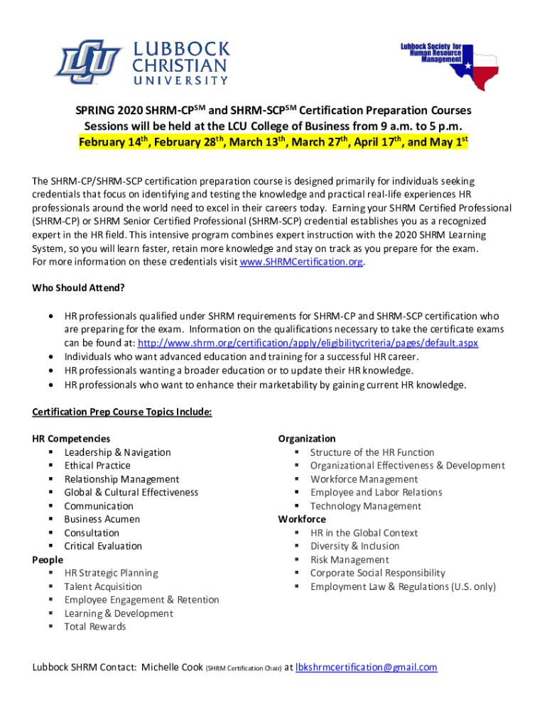 SPRING 2020 SHRMCPSM and SHRMSCPSM Certification Preparation Courses Sessions will be held at the LCU College of Business from 9 a.m. to 5 p.m. February 14th, February 28th, March 13th, March 27th,