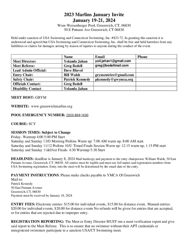 2023 Marlins January Invite January 1921, 2024 WrenWeisenberger Pool, Greenwich, CT, 06830 50 E Putnam Ave Greenwich, CT 06830 Held under sanction of USA Swimming and Connecticut Swimming, Inc. #S2372.
