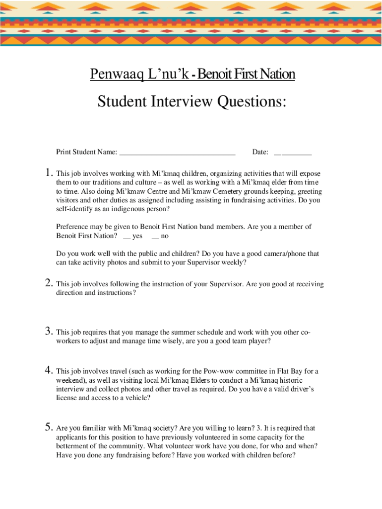 Penwaaq Lnuk Benoit First NationStudent Interview Questions: Print Student Name: ___Date: ___1. This job involves working with Mikmaq children, organizing activities that will exposethem to our traditions