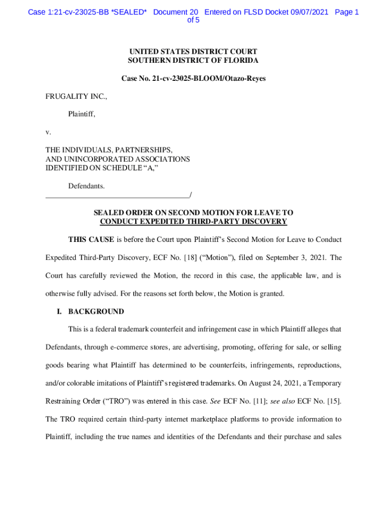 Case 1:21cv23025BB *SEALED* Document 20 Entered on FLSD Docket 09/07/2021 Page 1 of 5UNITED STATES DISTRICT COURT SOUTHERN DISTRICT OF FLORIDA Case No. 21cv23025BLOOM/OtazoReyes FRUGALITY INC., Plaintiff,