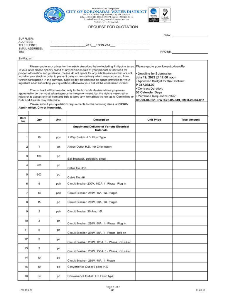 REQUEST FOR QUOTATION Date: SUPPLIER: ADDRESS: TELEPHONE: EMAIL ADDRESS: TIN:___ ___ ___VAT___/ NONVAT___ ___ ___RFQ No.Sir/Madam: Please quote your prices for the article described below including