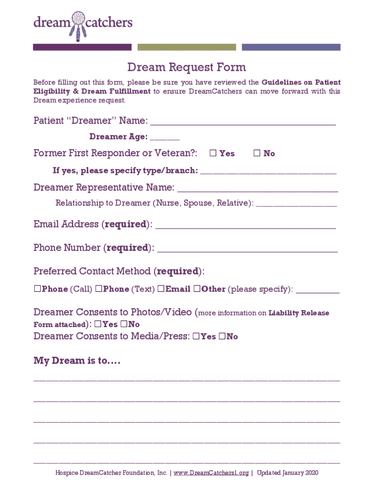 Dream Request Form Before filling out this form, please be sure you have reviewed the Guidelines on Patient Eligibility & Dream Fulfillment to ensure DreamCatchers can move forward with this Dream