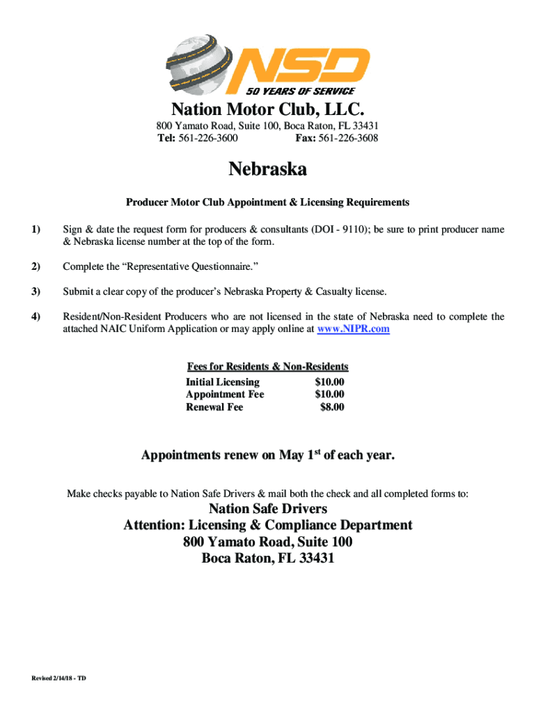 Nation Motor Club, LLC. 800 Yamato Road, Suite 100, Boca Raton, FL 33431 Tel: 5612263600 Fax: 5612263608Nebraska Producer Motor Club Appointment & Licensing Requirements 1)Sign & date the request