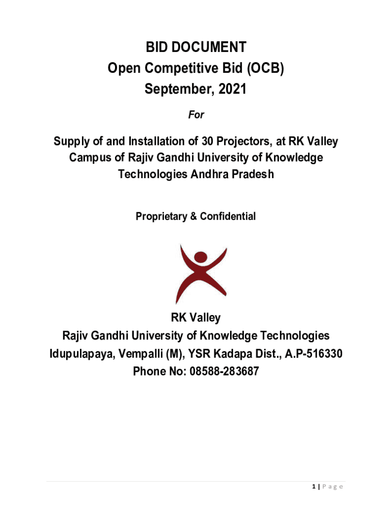 BID DOCUMENT Open Competitive Bid (OCB) September, 2021 ForSupply of and Installation of 30 Projectors, at RK Valley Campus of Rajiv Gandhi University of Knowledge Technologies Andhra PradeshProprietary