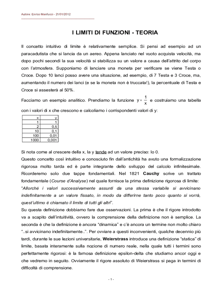 Autore: Enrico Manfucci 21/01/2012 ___I LIMITI DI FUNZIONI TEORIA Il concetto intuitivo di limite relativamente semplice. Si pensi ad esempio ad un paracadutista che si lancia da un aereo. Appena