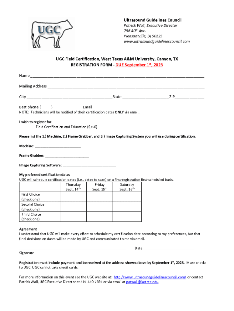Ultrasound Guidelines CouncilPatrick Wall, Executive Director 796 40th Ave. Pleasantville, IA 50225 www.ultrasoundguidelinescouncil.comUGC Field Certification, West Texas A&M University, Canyon, TX