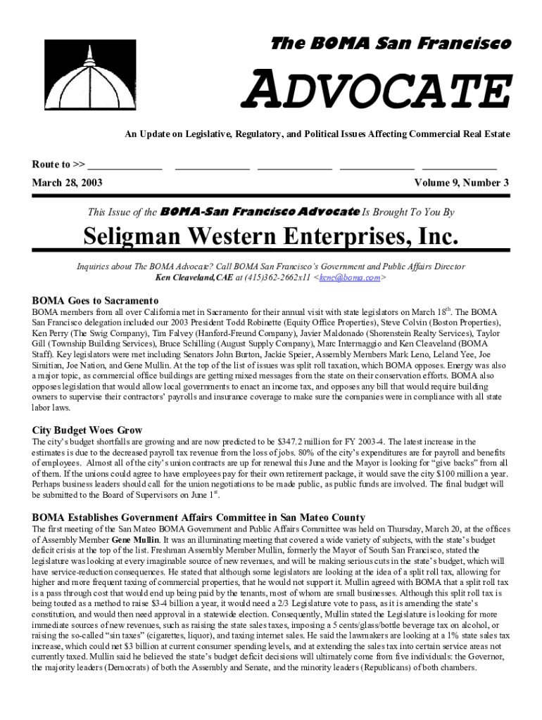 The BOMA San FranciscoADVOCATEAn Update on Legislative, Regulatory, and Political Issues Affecting Commercial Real EstateRoute to ______ ___ ___ ___March 28, 2003Volume 9, Number 3This Issue of the