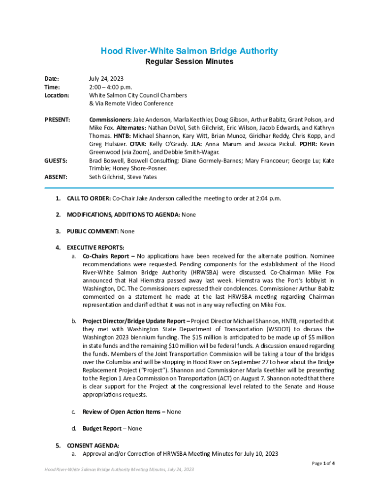 Hood RiverWhite Salmon Bridge Authority Regular Session MinutesDate: Time: Locaon:July 24, 2023 2:00 4:00 p.m. White Salmon City Council Chambers & Via Remote Video ConferencePRESENT:Commissioners: