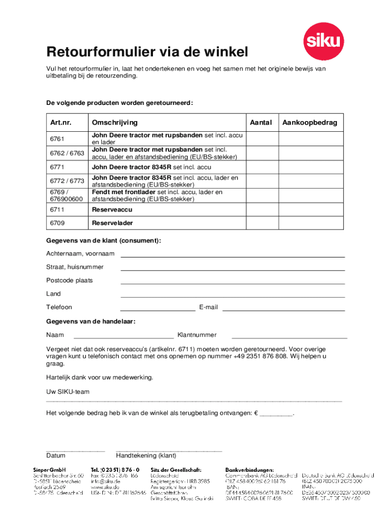 Retourformulier via de winkel Vul het retourformulier in, laat het ondertekenen en voeg het samen met het originele bewijs van uitbetaling bij de retourzending.De volgende producten worden geretourneerd:Art.nr.