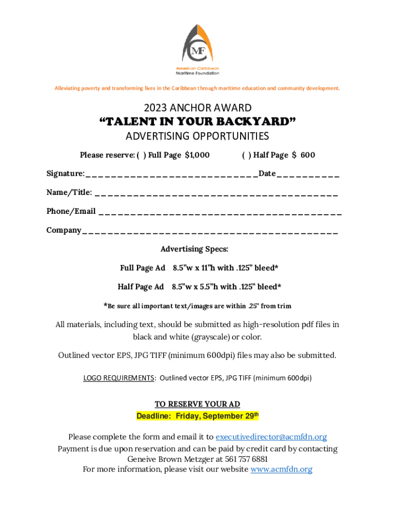 Alleviating poverty and transforming lives in the Caribbean through maritime education and community development.2023 ANCHOR AWARD TALENT IN YOUR BACKYARD ADVERTISING OPPORTUNITIES Please reserve: