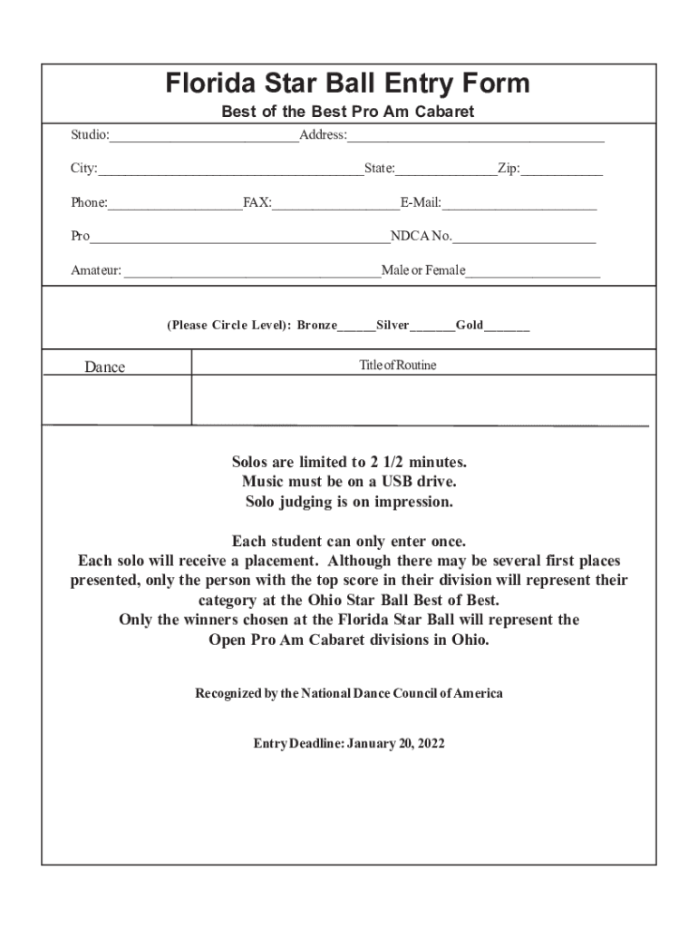 Florida Star Ball Entry Form Best of the Best Pro Am Cabaret Studio:___Address:___ City:___State:___Zip:___ Phone:___FAX:___EMail:___ Pro___NDCA No.___ Amateur: ___Male or Female___(Please Circle
