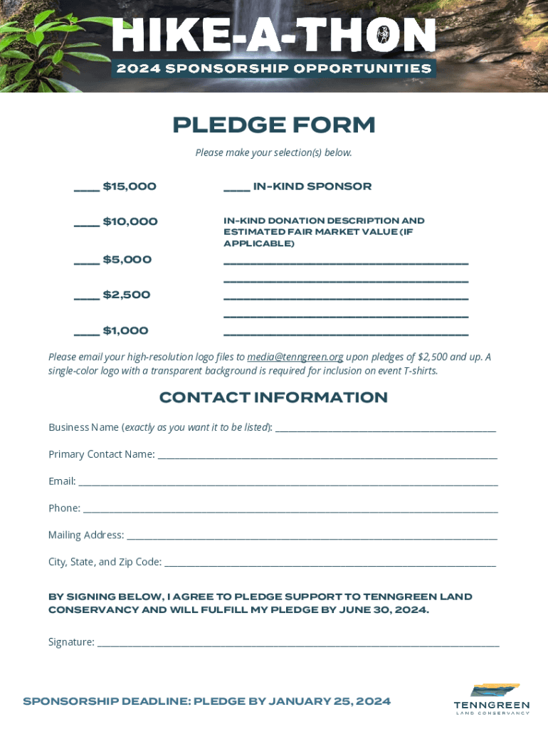 PLEDGE FORM Please make your selection(s) below. ___ $15,000___ INKIND SPONSOR___ $10,000INKIND DONATION DESCRIPTION AND ESTIMATED FAIR MARKET VALUE (IF APPLICABLE)___ $5,000___ ______ $2,500___ ______