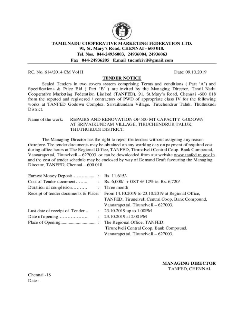 TAMILNADU COOPERATIVE MARKETING FEDERATION LTD. 91, St. Marys Road, CHENNAI 600 018. Tel. Nos. 04424936003, 24936004, 24936063 Fax 04424936205 E.mail tncmfcivil@gmail.com RC. No. 614/2014 CM Vol IIDate: