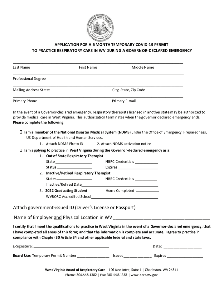 APPLICATION FOR A 6 MONTH TEMPORARY COVID19 PERMIT TO PRACTICE RESPIRATORY CARE IN WV DURING A GOVERNORDECLARED EMERGENCY ___ Last Name First Name Middle Name ___ Professional Degree ___ Mailing Address