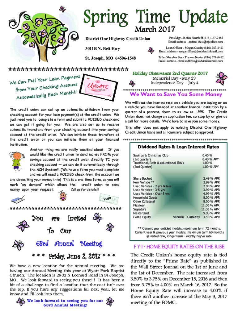 March 2017 District One Highway Credit UnionPres/Mgr Robin Shurtleff (816) 3872465 Email address robind1hcu@stjoelive.com3011B N. Belt HwyLoan Officer Megan Cassity (816) 3872423 Email address megand1hcu@suddenlinkmail.comSt.