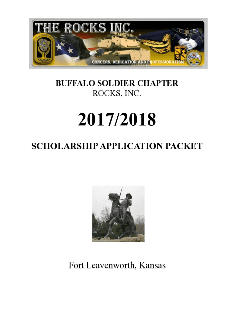 BUFFALO SOLDIER CHAPTER ROCKS, INC.2017/2018 SCHOLARSHIP APPLICATION PACKETFort Leavenworth, KansasBUFFALO SOLDIER CHAPTER ROCKS, INC. 20172018 SCHOLARSHIP APPLICATION ELIGIBILITY REQUIREMENTS APPLICANTS