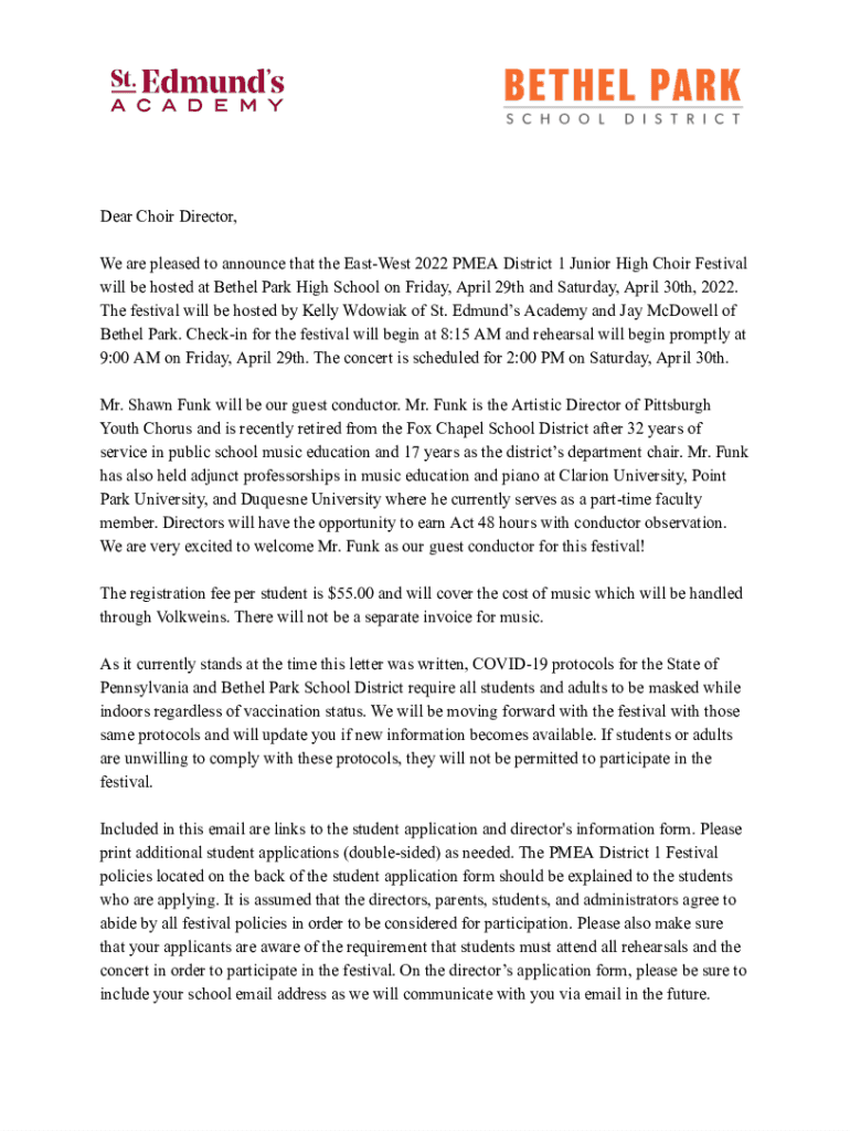 Dear Choir Director, We are pleased to announce that the EastWest 2022 PMEA District 1 Junior High Choir Festival will be hosted at Bethel Park High School on Friday, April 29th and Saturday, April