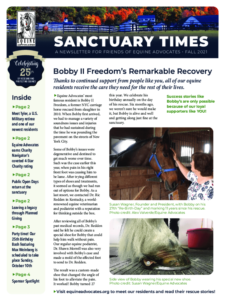 SANCTUARY TIMES A NEWSLETTER FOR FRIENDS OF EQUINE ADVOCATES FALL 2021Celebrating25yrsOF RESCUING AND PROTECTING EQUINESInside Page 2 Meet Tyler, a U.S. Military retiree and one of our newest residents