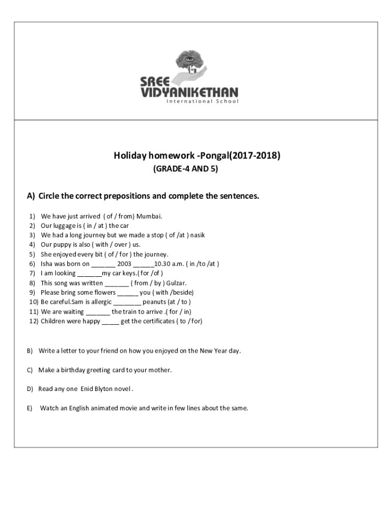 Holiday homework Pongal(20172018) (GRADE4 AND 5) A) Circle the correct prepositions and complete the sentences. 1) 2) 3) 4) 5) 6) 7) 8) 9) 10) 11) 12)We have just arrived ( of / from) Mumbai. Our