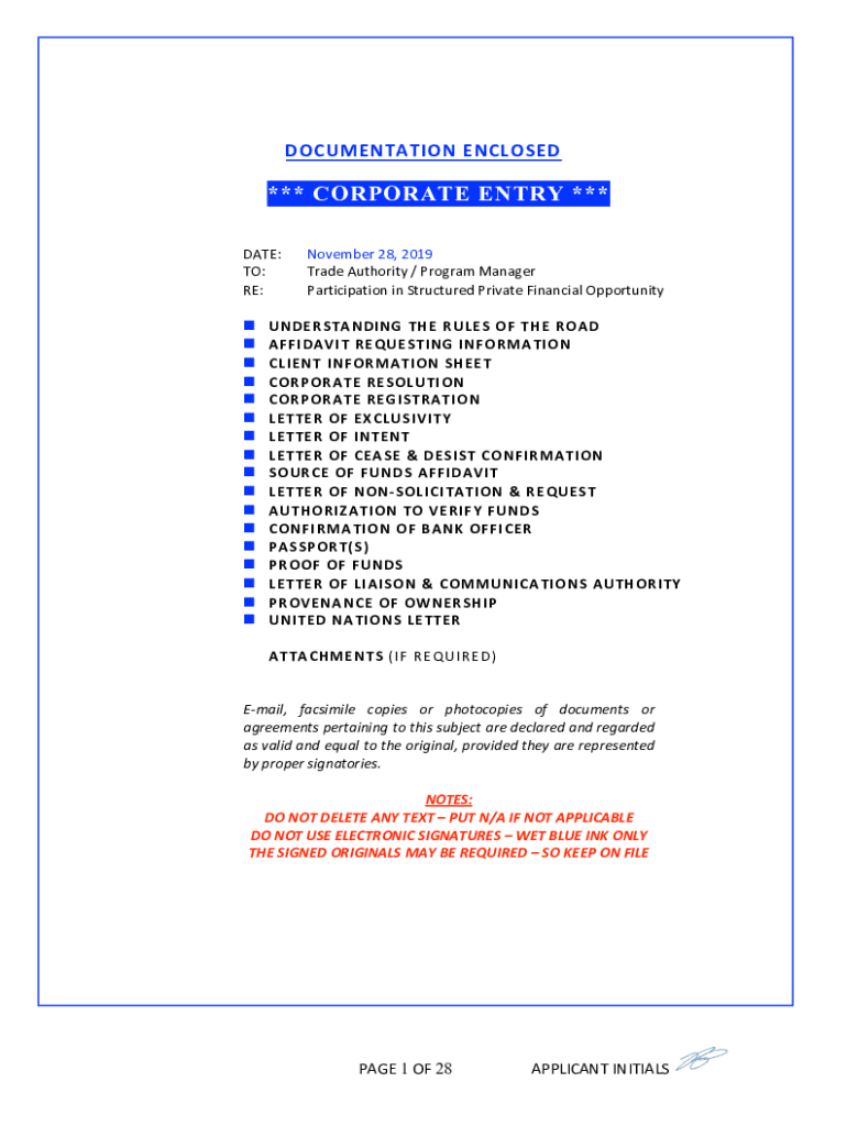 DOCUMENTATION ENCLOSED*** CORPORATE ENTRY ***DATE:November 28, 2019TO:Trade Authority / Program ManagerRE:Participation in Structured Private Financial Opportunityn UNDERSTANDING THE RULES OF THE