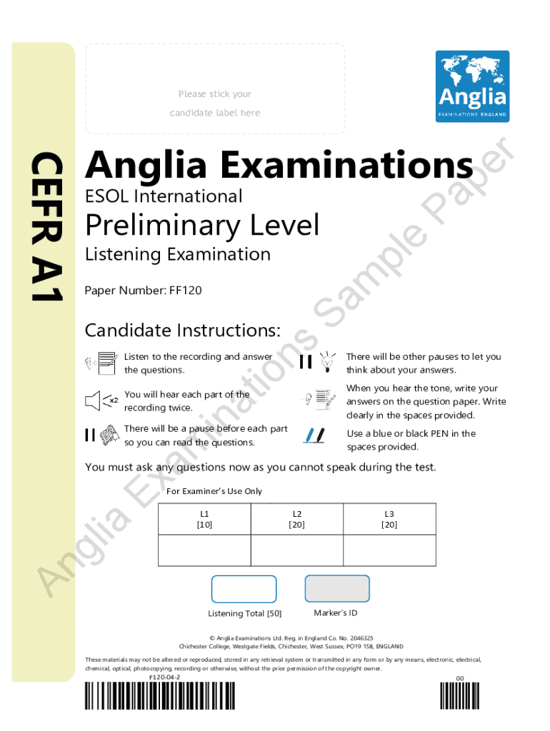 Please stick your candidate label herePa pe rCEFR A1Anglia ExaminationsPreliminary Level Paper Number: FF120in at io nsCandidate Instructions:Sa mListening Examinationpl eESOL InternationalListen