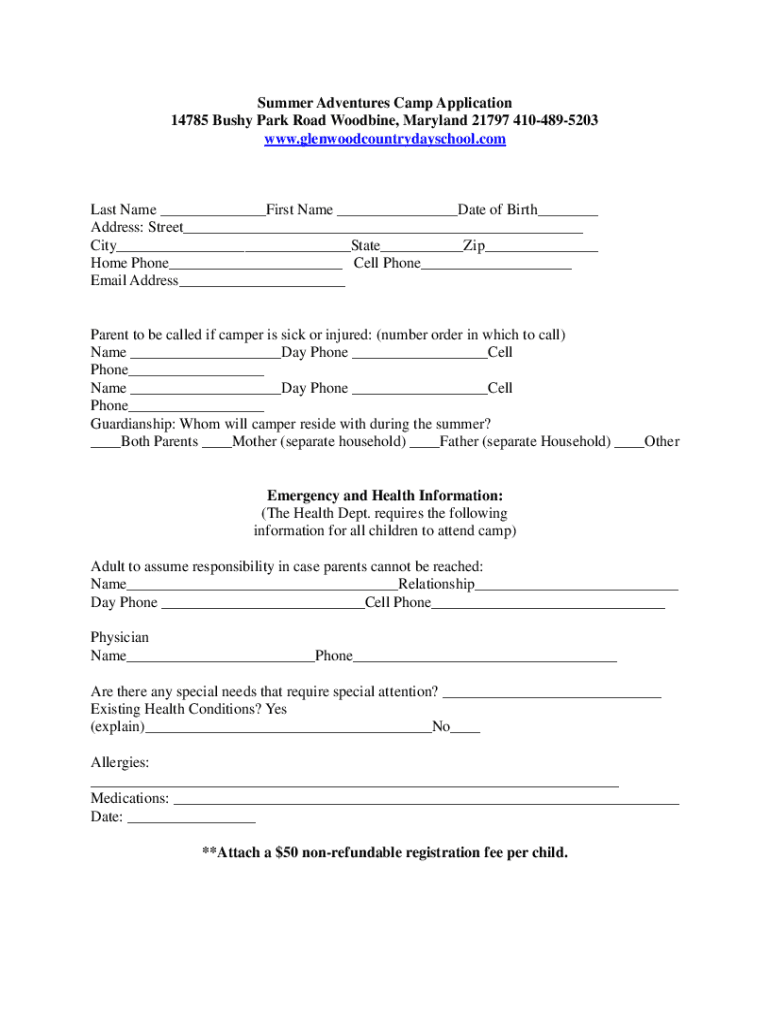 Summer Adventures Camp Application 14785 Bushy Park Road Woodbine, Maryland 21797 4104895203 www.glenwoodcountrydayschool.comLast Name ___First Name ___Date of Birth___ Address: Street___ City___State___Zip___
