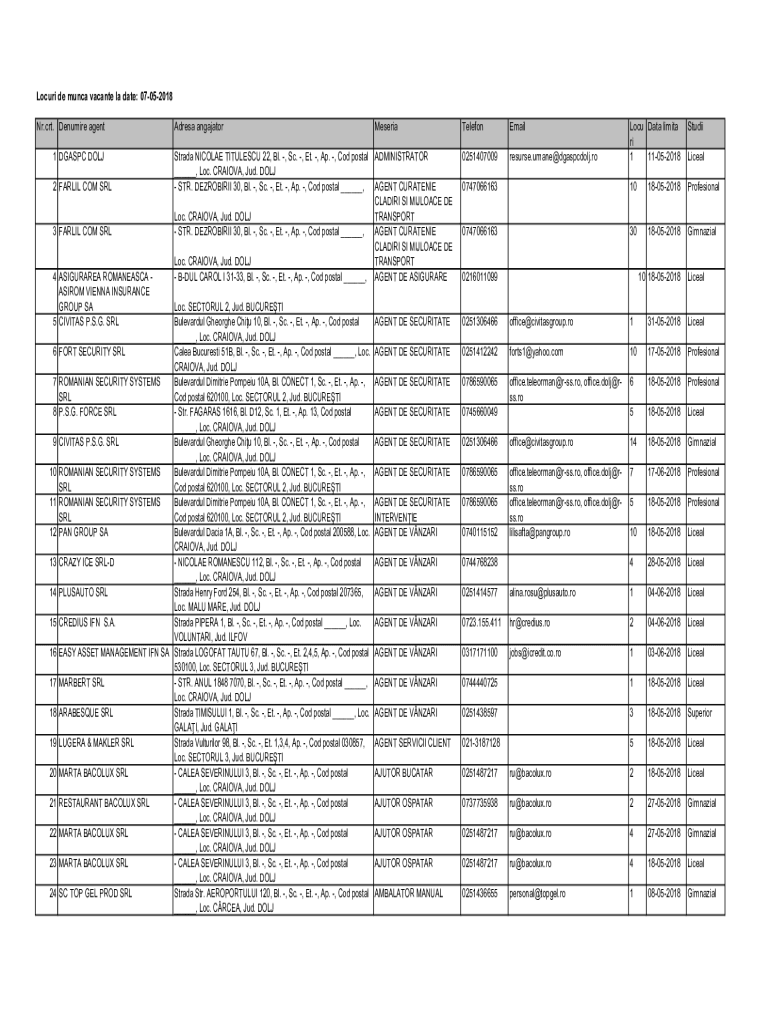 Locuri de munca vacante la date: 07052018 Nr.crt. Denumire agent 1 DGASPC DOLJ 2 FARLIL COM SRL3 FARLIL COM SRL4 ASIGURAREA ROMANEASCA ASIROM VIENNA INSURANCE GROUP SA 5 CIVITAS P.S.G. SRL 6 7 8 9
