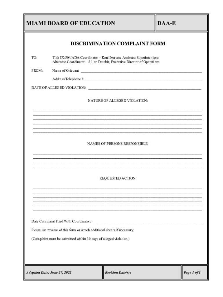 MIAMI BOARD OF EDUCATIONDAAEDISCRIMINATION COMPLAINT FORM TO:Title IX/504/ADA Coordinator Keni Iverson, Assistant Superintendent Alternate Coordinator Jillian Douthit, Executive Director of OperationsFROM:Name