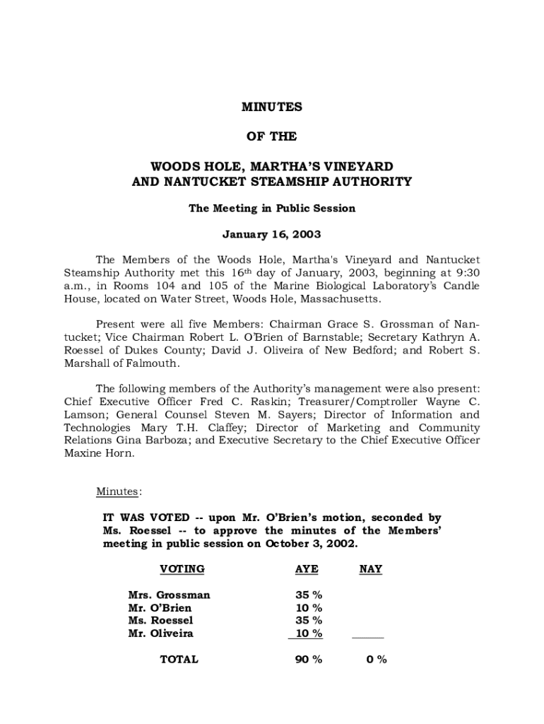 MINUTES OF THE WOODS HOLE, MARTHAS VINEYARD AND NANTUCKET STEAMSHIP AUTHORITY The Meeting in Public Session January 16, 2003 The Members of the Woods Hole, Martha\'s Vineyard and Nantucket Steamship