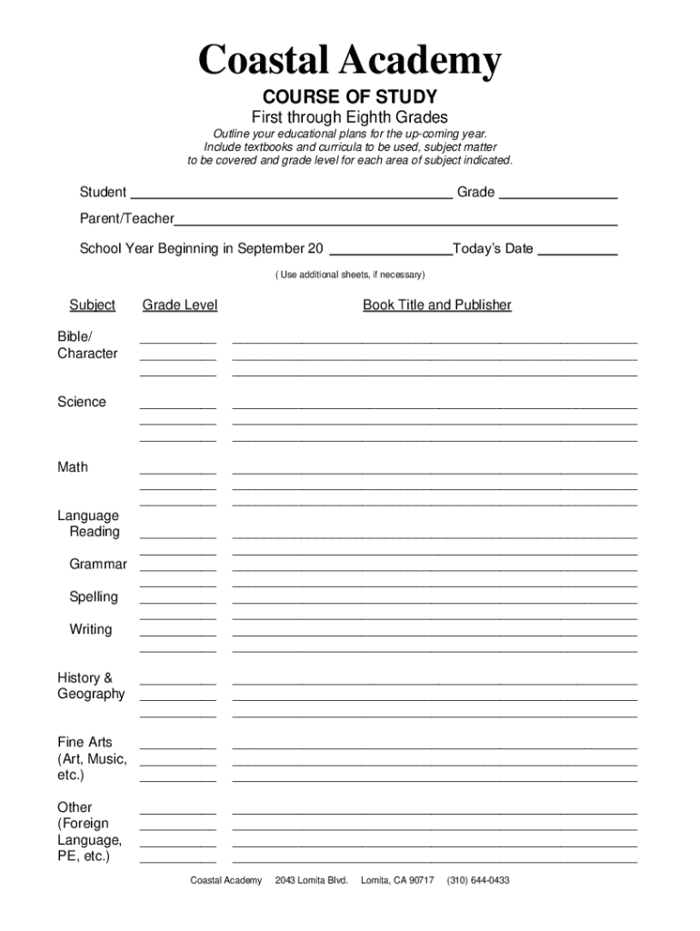 Coastal Academy COURSE OF STUDY First through Eighth Grades Outline your educational plans for the upcoming year. Include textbooks and curricula to be used, subject matter to be covered and grade