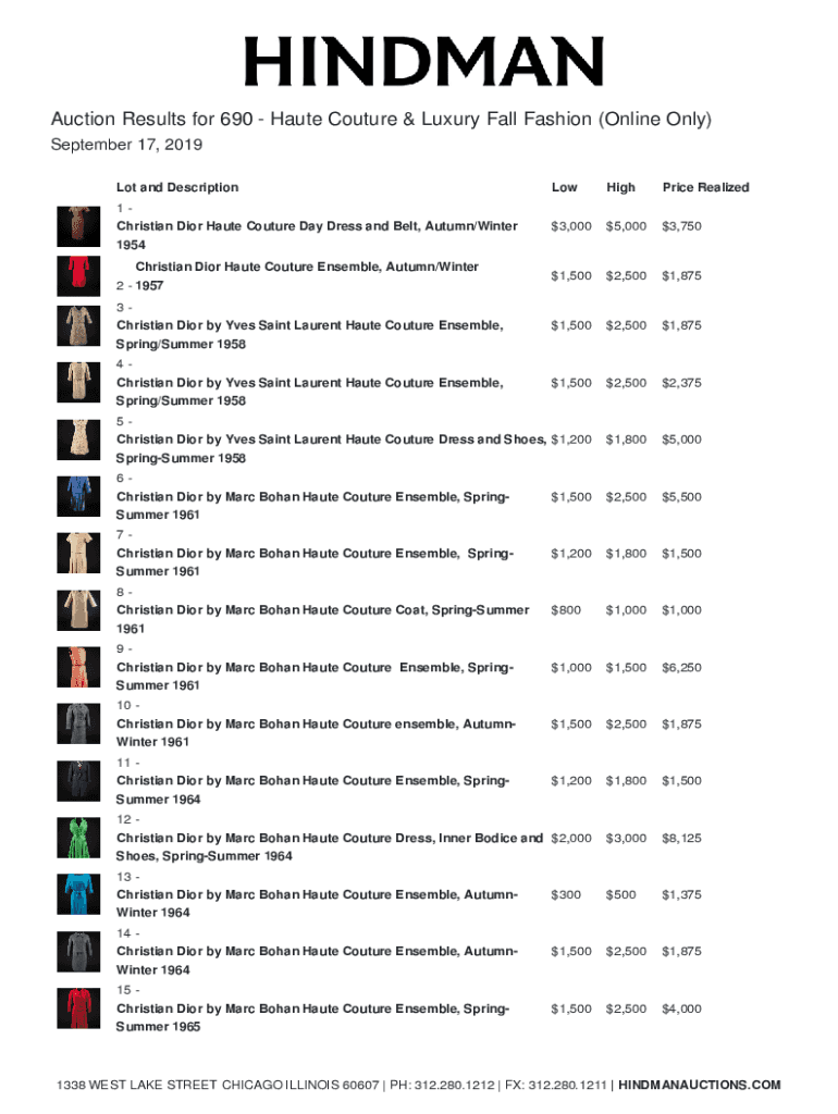 Auction Results for 690 Haute Couture & Luxury Fall Fashion (Online Only) September 17, 2019 Lot and DescriptionLowHighPrice Realized$3,000$5,000$3,750Christian Dior Haute Couture Ensemble, Autumn/Winter