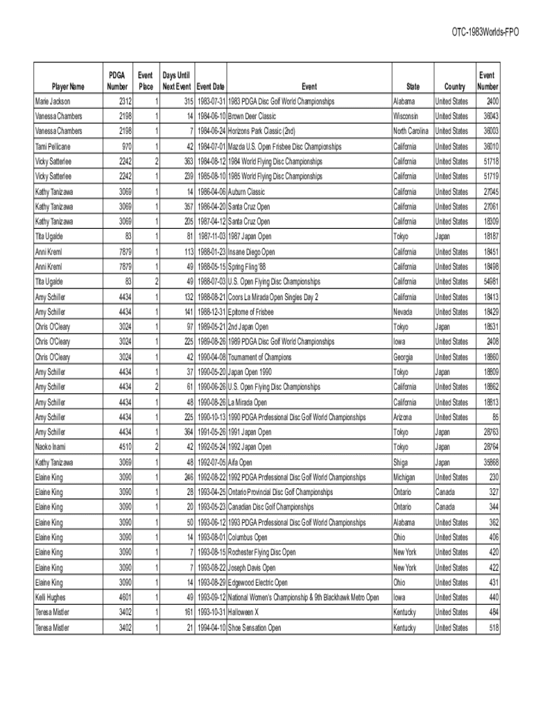 OTC1983WorldsFPOPlayer NamePDGA NumberEvent PlaceDays Until Next EventEvent DateEventMarie Jackson23121Vanessa Chambers21981315 19830731 1983 PDGA Disc Golf World ChampionshipsVanessa Chambers21981Tami