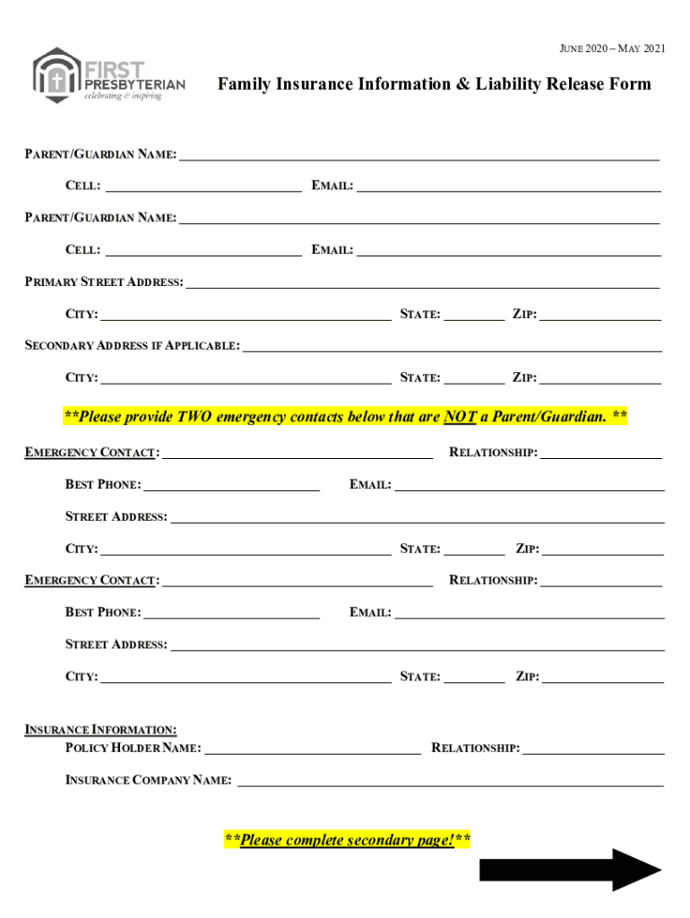 JUNE 2020 MAY 2021Family Insurance Information & Liability Release FormPARENT/GUARDIAN NAME: ___ CELL: ___ EMAIL: ___ PARENT/GUARDIAN NAME: ___ CELL: ___ EMAIL: ___ PRIMARY STREET ADDRESS: ___ CITY: