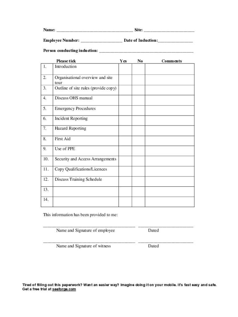 Name: ___ Site: ___ Employee Number: ___ Date of Induction:___ Person conducting induction: ___1. 2.Please tick Introduction3.Organisational overview and site tour Outline of site rules (provide copy)4.Discuss