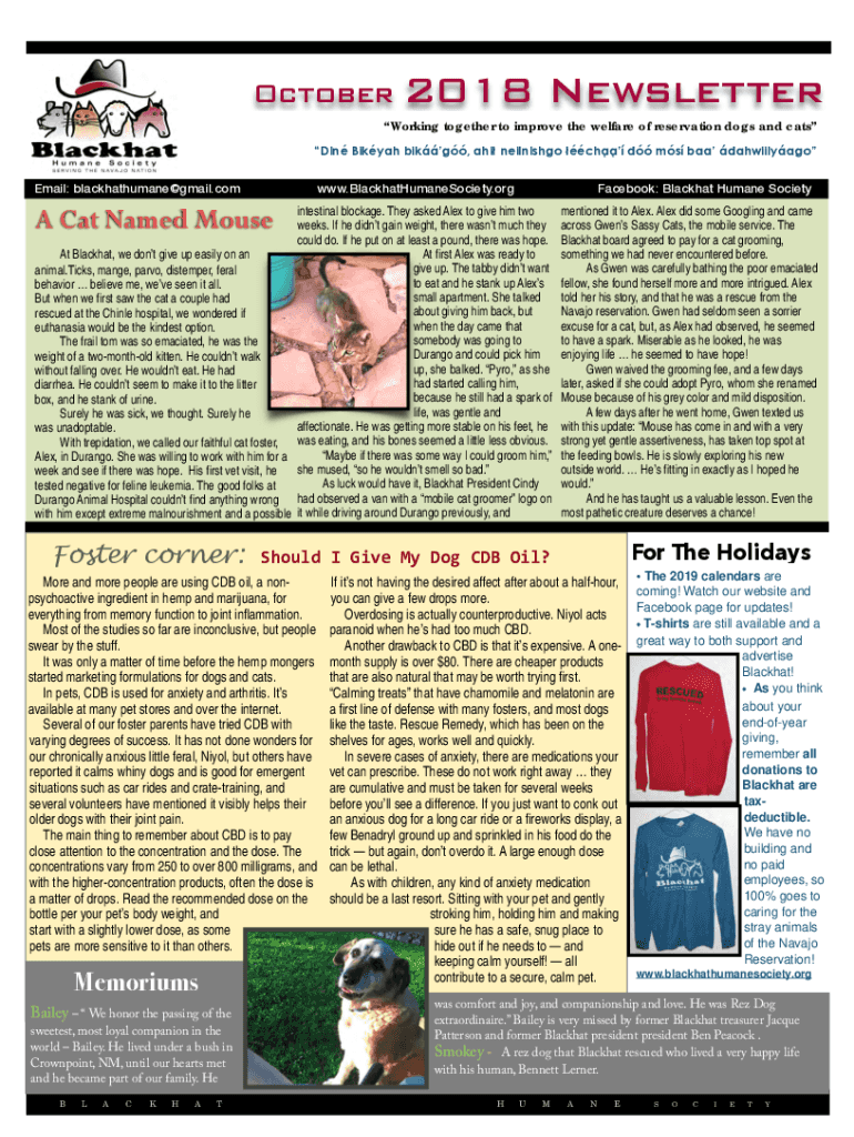 October 2018NewsletterWorking together to improve the welfare of reservation dogs and cats Din4 Bik4yah bik11g00, ahi[ neilnishgo [44ch227 d00 m0s7 baa 1dahwiily1ago Email: blackhathumane@gmail.comwww.BlackhatHumaneSociety.orgFacebook: