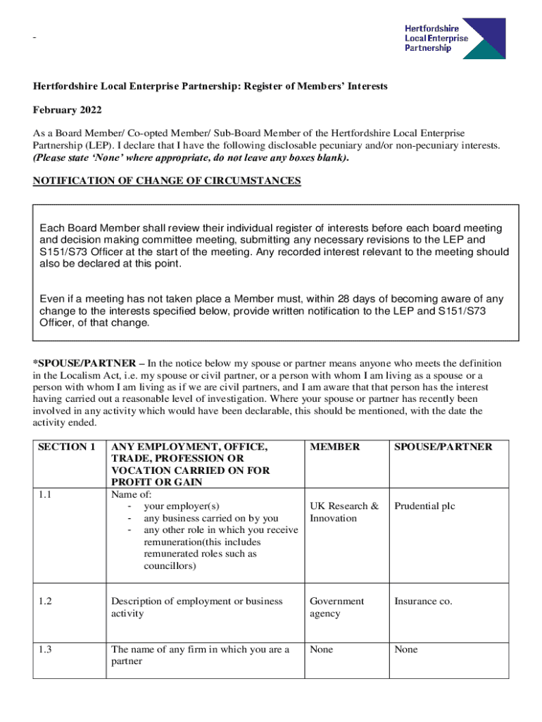 Hertfordshire Local Enterprise Partnership: Register of Members Interests February 2022 As a Board Member/ Coopted Member/ SubBoard Member of the Hertfordshire Local Enterprise Partnership (LEP).