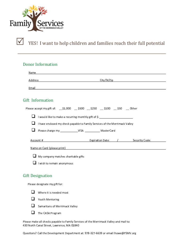 YES! I want to help children and families reach their full potentialDonor Information Name AddressCity/St/ZipEmailGift Information Please accept my gift of:__$1,000__ $500 __ $250__ $100__ $50__ OtherI
