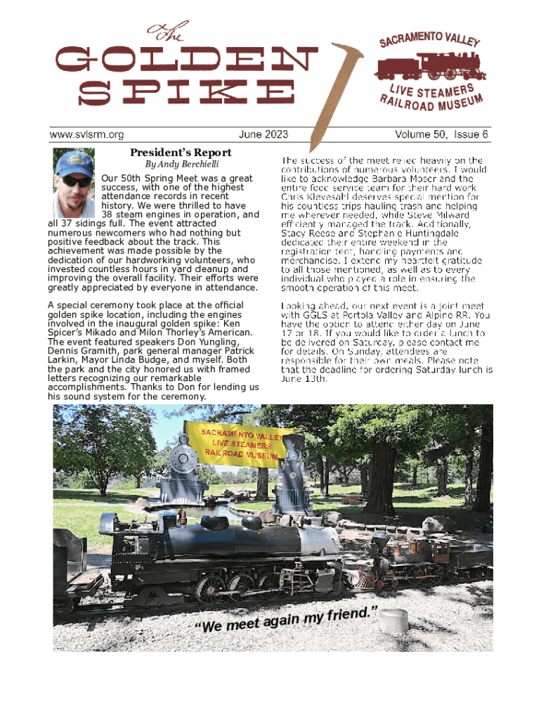Presidents Report By Andy Berchielli Our 50th Spring Meet was a great success, with one of the highest attendance records in recent history. We were thrilled to have 38 steam engines in operation,