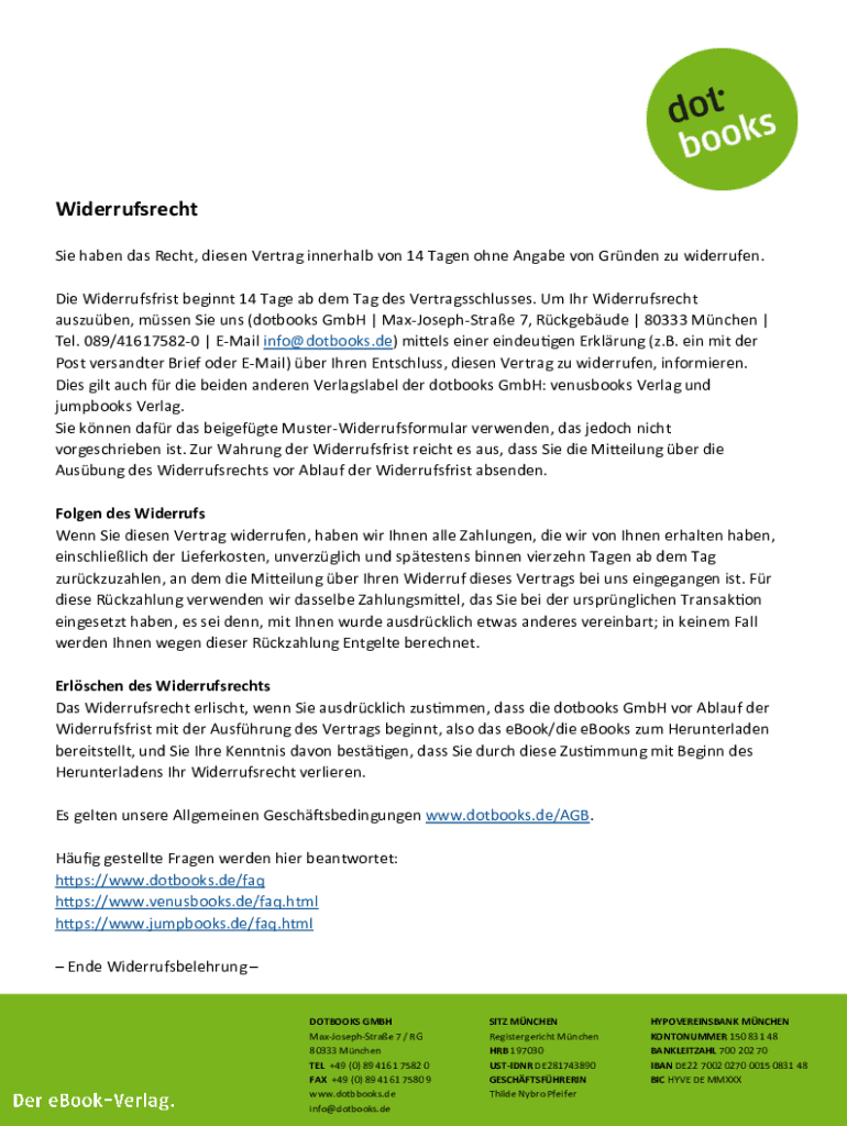 Widerrufsrecht Sie haben das Recht, diesen Vertrag innerhalb von 14 Tagen ohne Angabe von Grnden zu widerrufen. Die Widerrufsfrist beginnt 14 Tage ab dem Tag des Vertragsschlusses. Um Ihr Widerrufsrecht