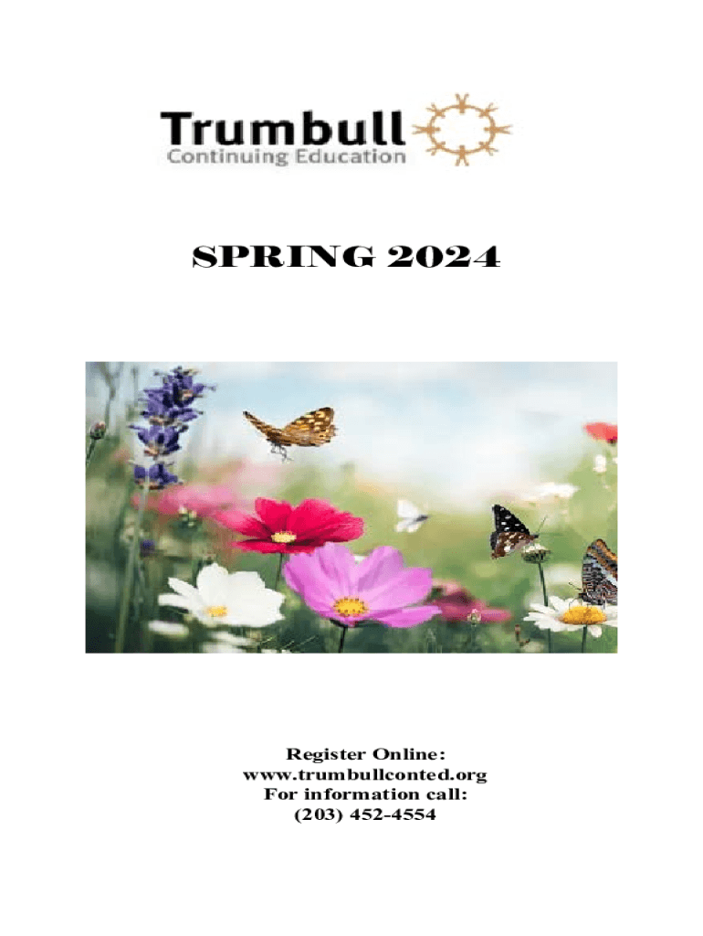 SPRING 2024Register Online: www.trumbullconted.org For information call: (203) 4524554Dr. Martin J. Semmel, Superintendent Christine Marr, Administrative AssistantMandated Academic ClassesESL, GED,