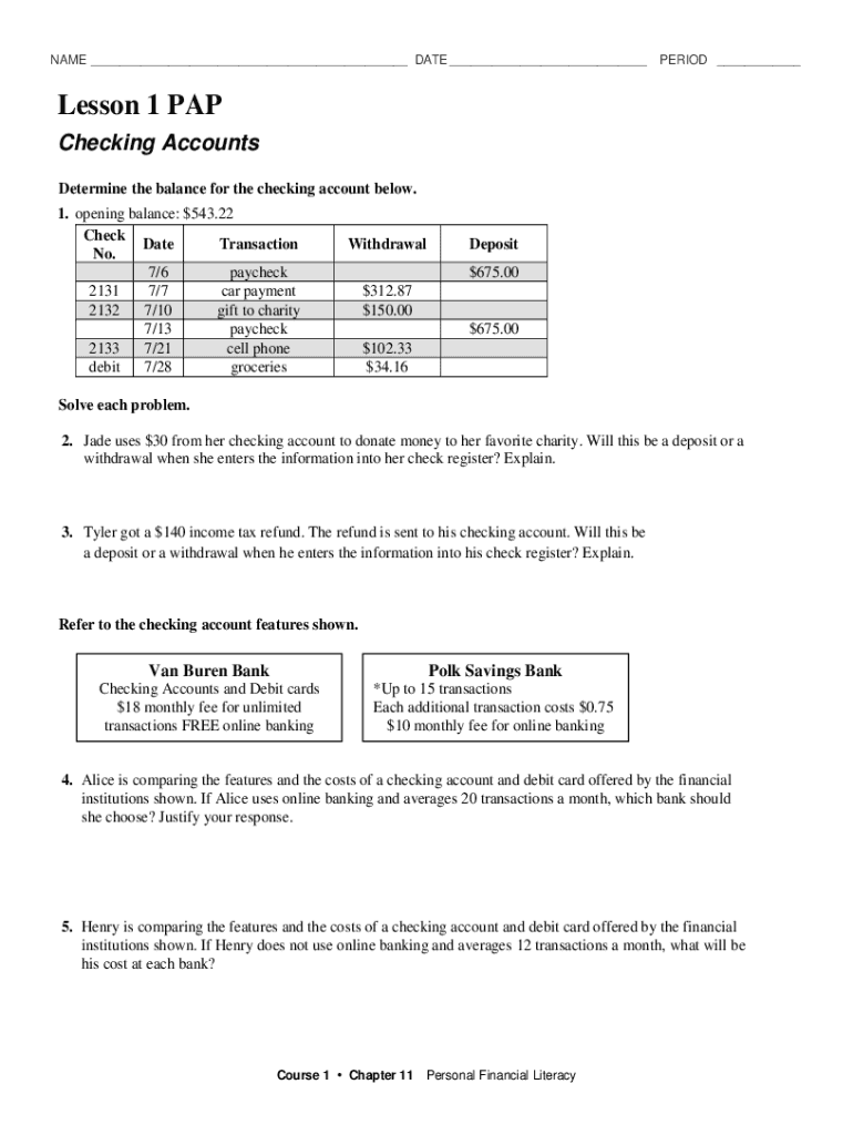 NAME ___ DATE ___PERIOD ___Lesson 1 PAP Checking Accounts Determine the balance for the checking account below. 1. opening balance: $543.22 Check Date Transaction No. 7/6 paycheck 2131 7/7 car payment