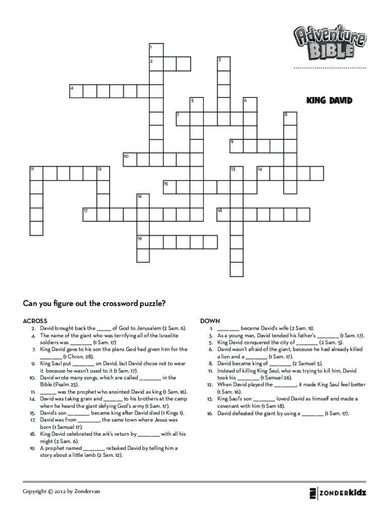 1 324 5king david6789 10 1113121415 16 171819Can you figure out the crossword puzzle? ACROSS2.David brought back the ___ of God to Jerusalem (2 Sam. 6).4.The name of the giant who was terrifying all
