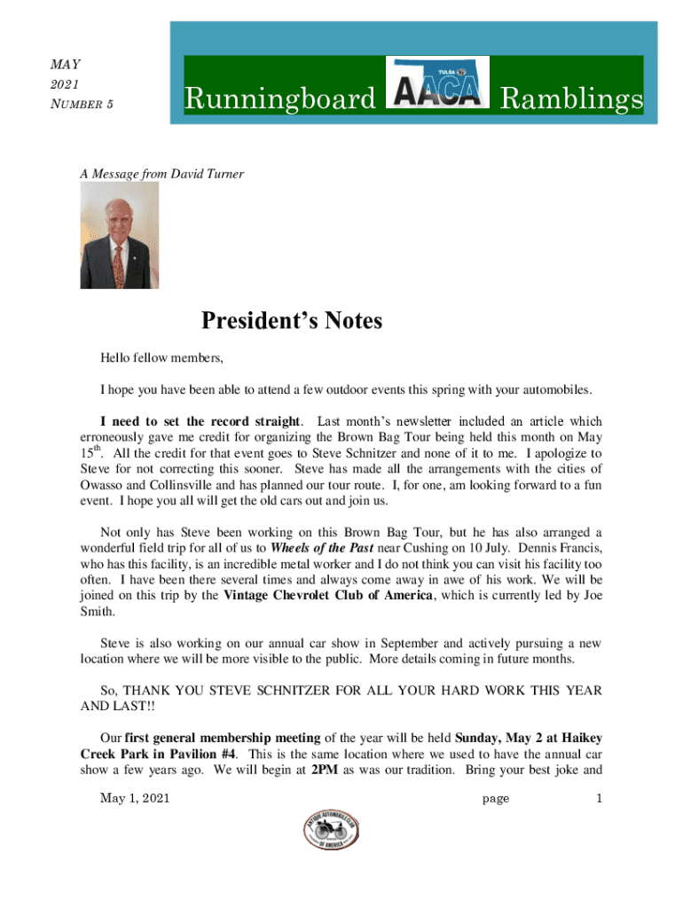MAY 2021 N UMBER 5RunningboardRamblingsA Message from David TurnerPresidents Notes Hello fellow members, I hope you have been able to attend a few outdoor events this spring with your automobiles.